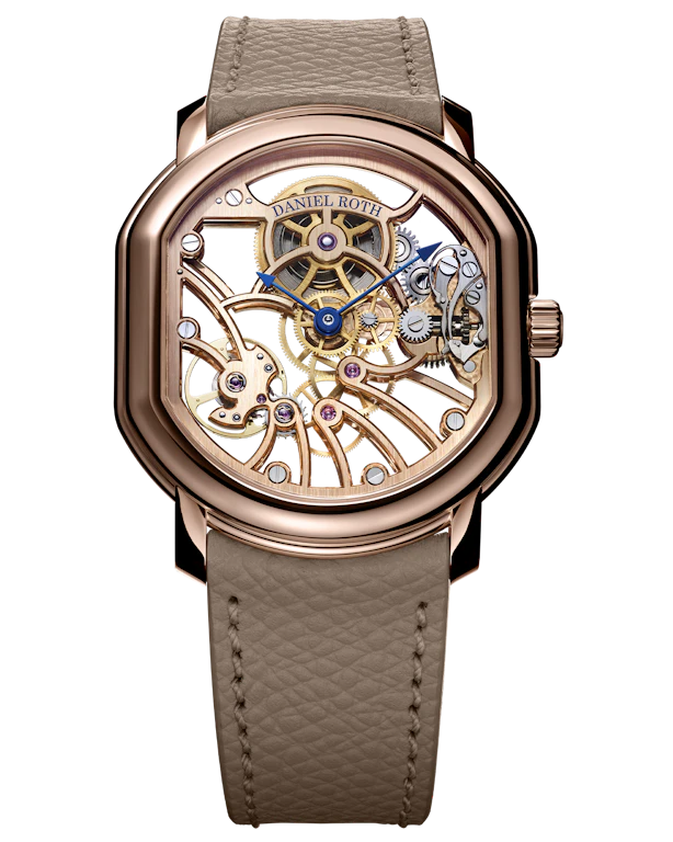 WITH ITS OPENWORKED REINTERPRETATION, THE EXTRA PLAT ROSE GOLD SKELETON UNVEILS A NEW FACET OF DANIEL ROTH, SHOWCASING THE ELEVATED LEVEL OF FINISHINGS APPLIED TO ITS MOVEMENT WHILE PAYING TRIBUTE TO THE GREAT TRADITIONS OF HIGH WATCHMAKING.