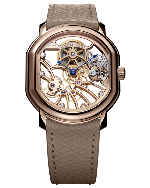 WITH ITS OPENWORKED REINTERPRETATION, THE EXTRA PLAT ROSE GOLD SKELETON UNVEILS A NEW FACET OF DANIEL ROTH, SHOWCASING THE ELEVATED LEVEL OF FINISHINGS APPLIED TO ITS MOVEMENT WHILE PAYING TRIBUTE TO THE GREAT TRADITIONS OF HIGH WATCHMAKING.