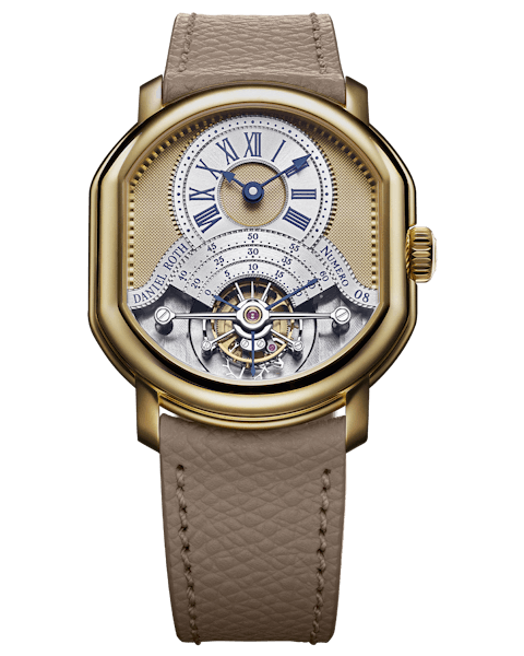 Formed from a plate of solid yellow gold and manufactured in collaboration with Kari Voutilainen's workshop, the dial is decorated with Clou de Paris Guilloche just as the original was.